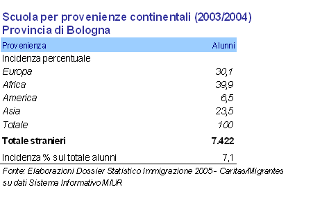 | L'Indagine sugli esiti degli alunni con cittadinanza non italiana pubblicata dal Ministero dell'istruzione nel gennaio 2005, su dati dell'anno scolastico 2003-2004 mostra che nelle scuole elementari esiste uno scarto del 3,4% in meno tra bambini stranieri e italiani che raggiungono la promozione. In Emilia-Romagna questo scarto è più ridotto (-3,0%). Nella scuola secondaria di primo grado il divario nazionale è del -7,1%, in Emilia-Romagna solo del -4,9% {in questo caso è lo scarto minore a livello nazionale). | ![]() |